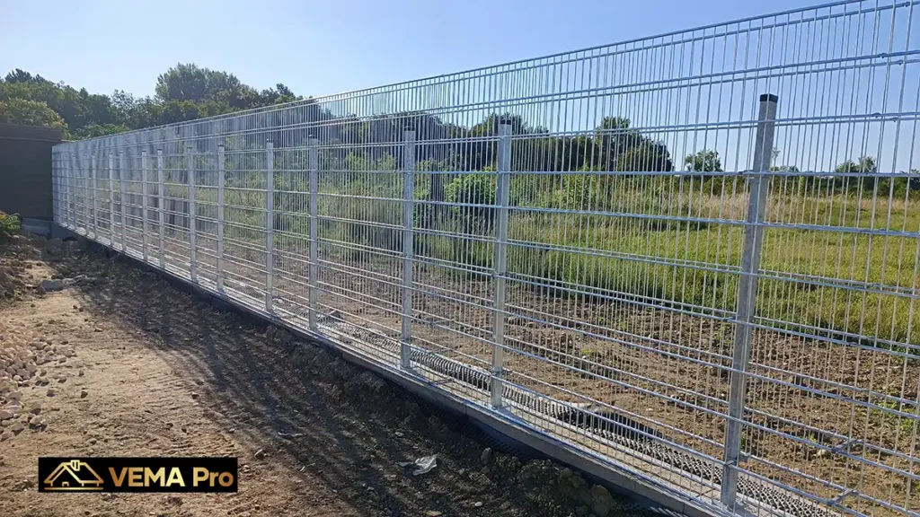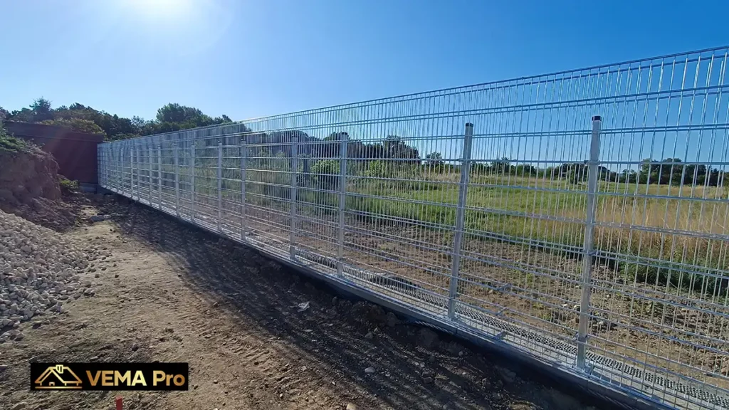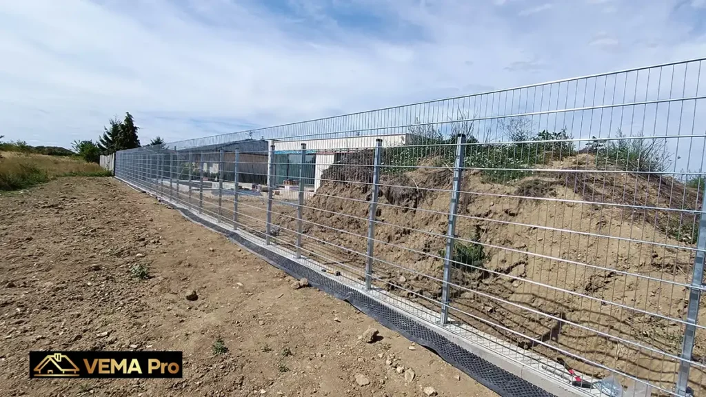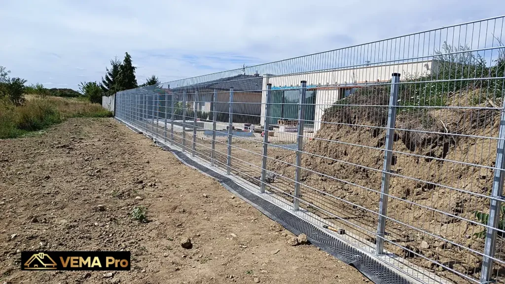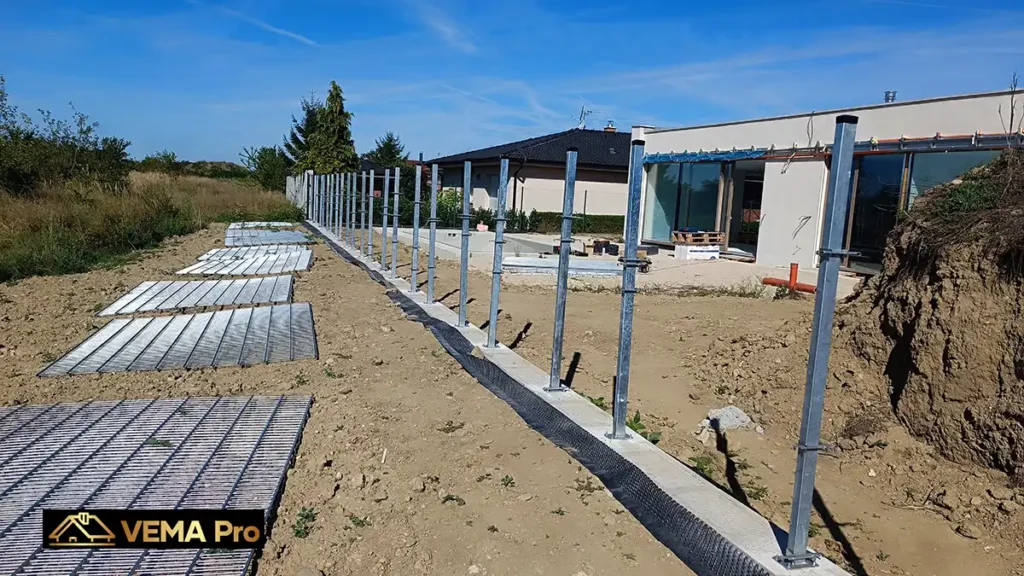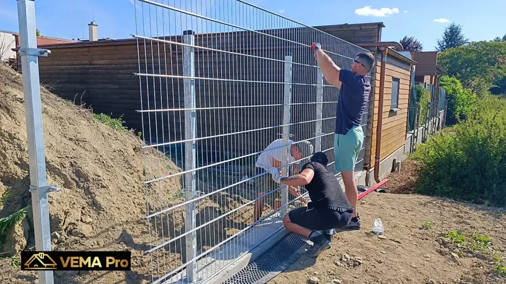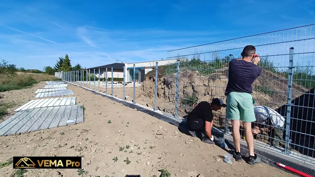 - 1. a 2. deň: Kotvenie stĺpikov a presná montáž 15 pletivových blokov.
